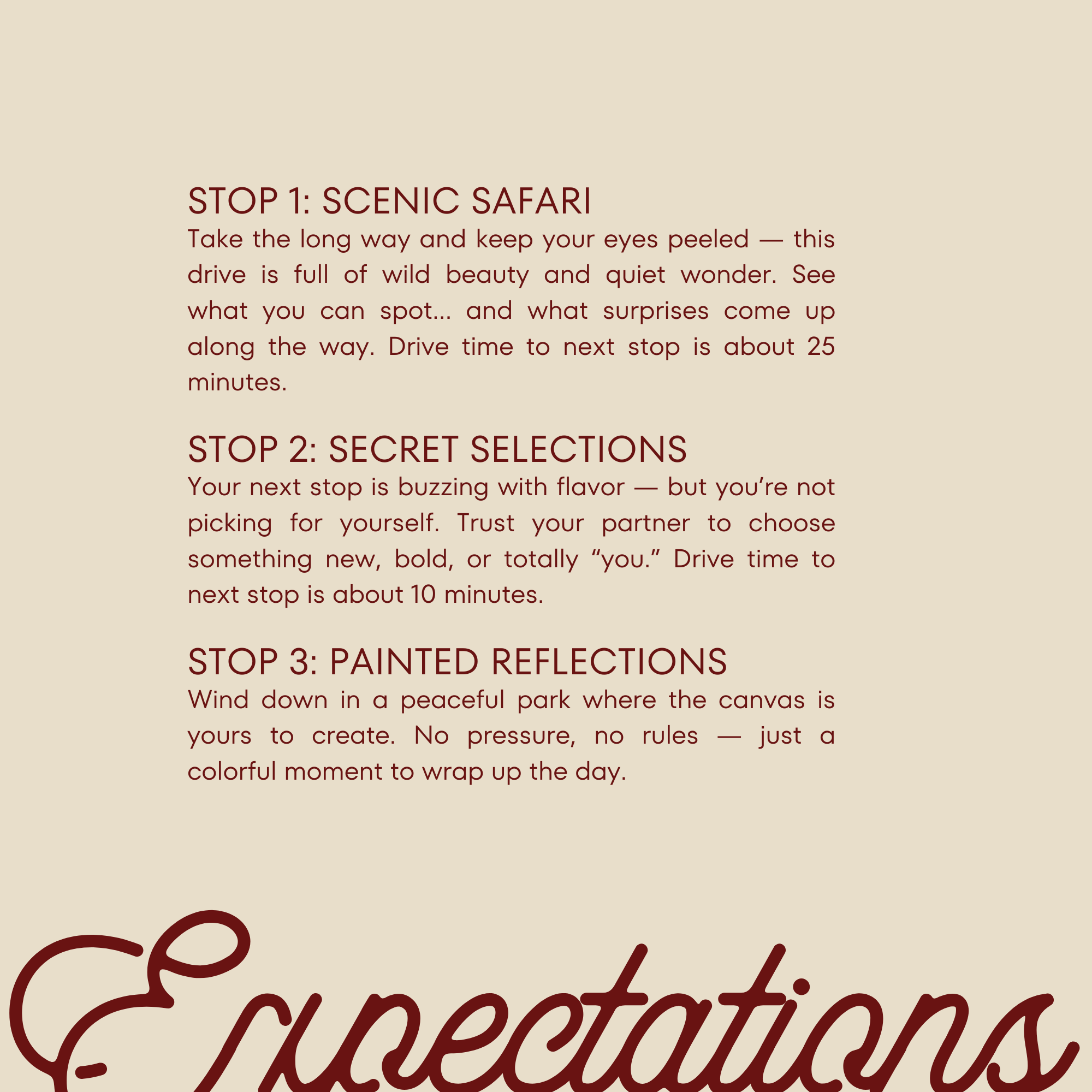 Your physical package includes an information booklet with tips and 3 separate booklets, each detailing a unique stop on your unforgettable mystery date.