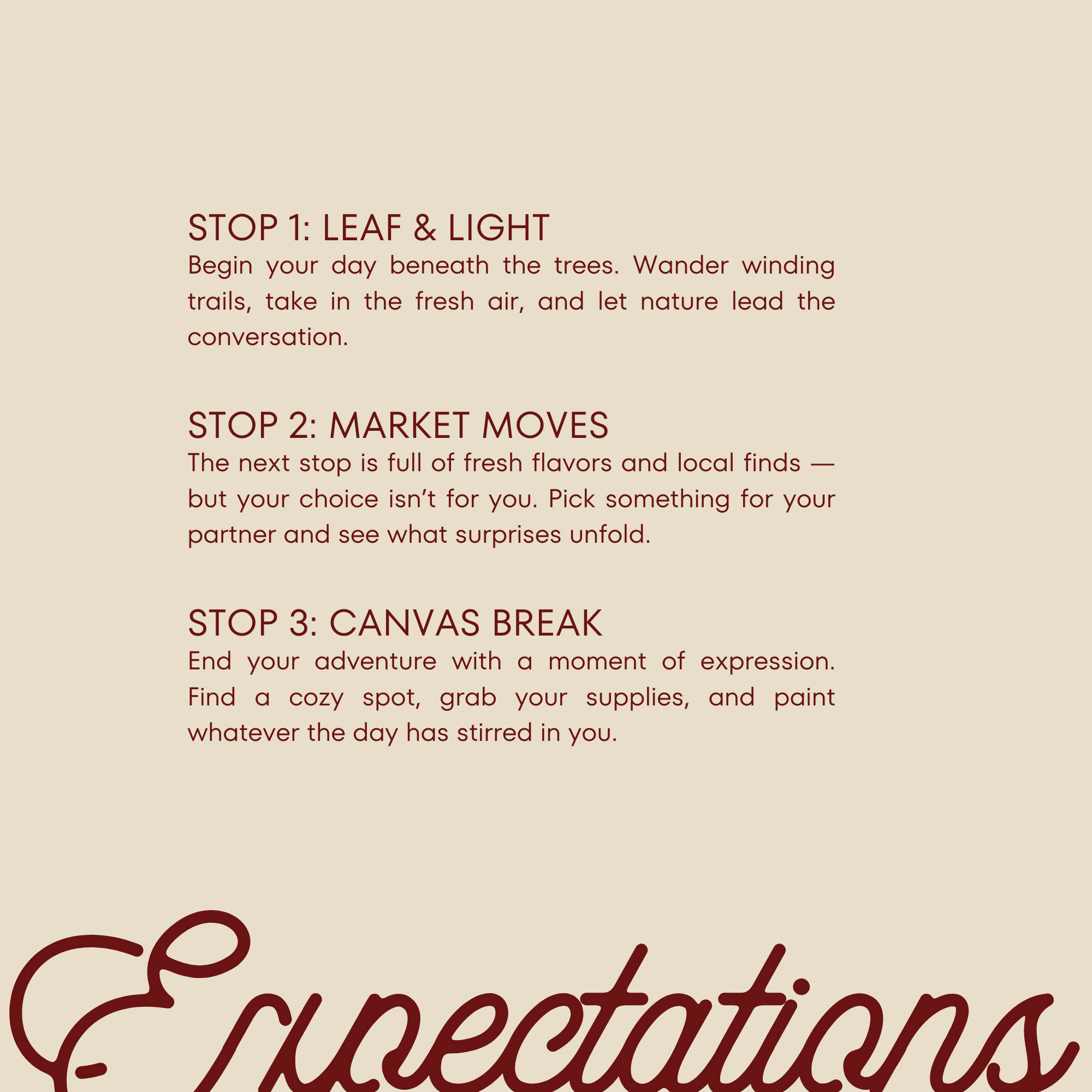 Wander through nature’s quiet beauty, surprise each other with local flavors, and end the day with something creative as the sun sets. Slow, intentional, and full of charm.