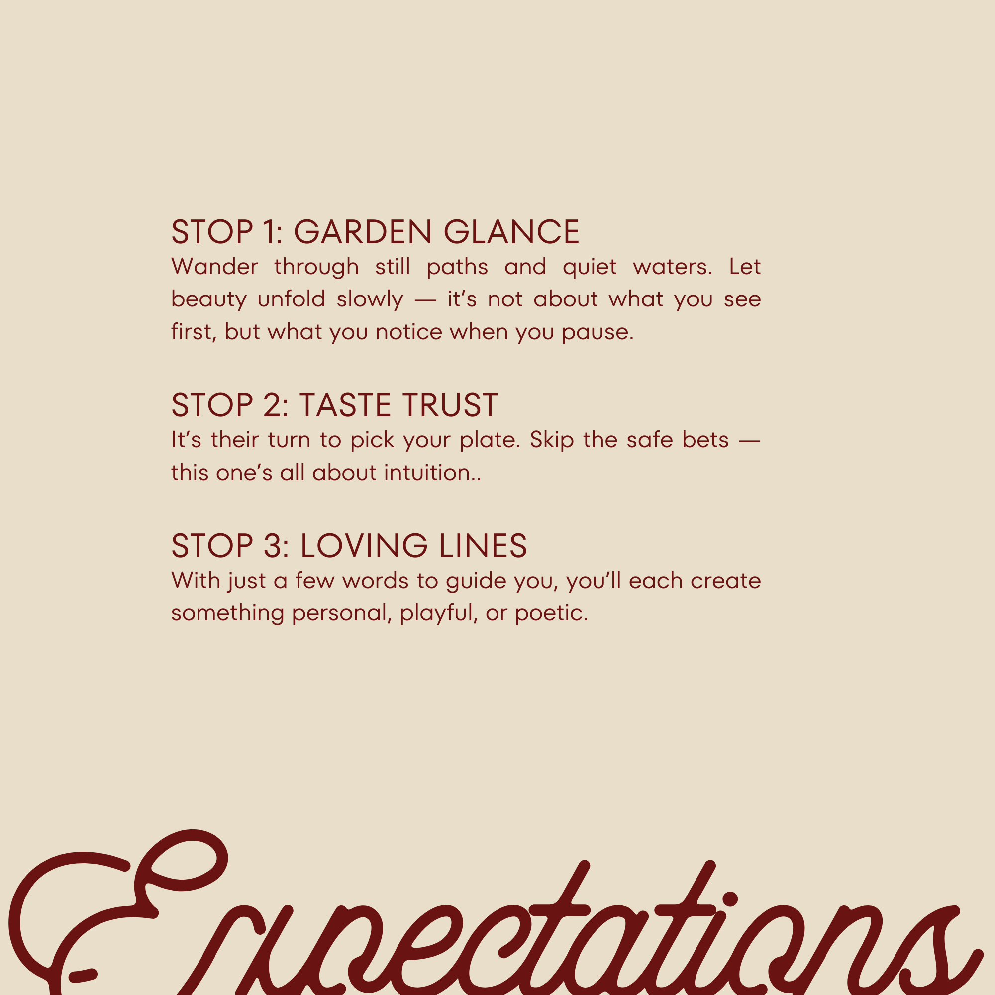 Wander through blooming paths, share surprise bites chosen with care, and end the day exchanging thoughts that mean more than they say. A heartfelt escape full of beauty and quiet connection.